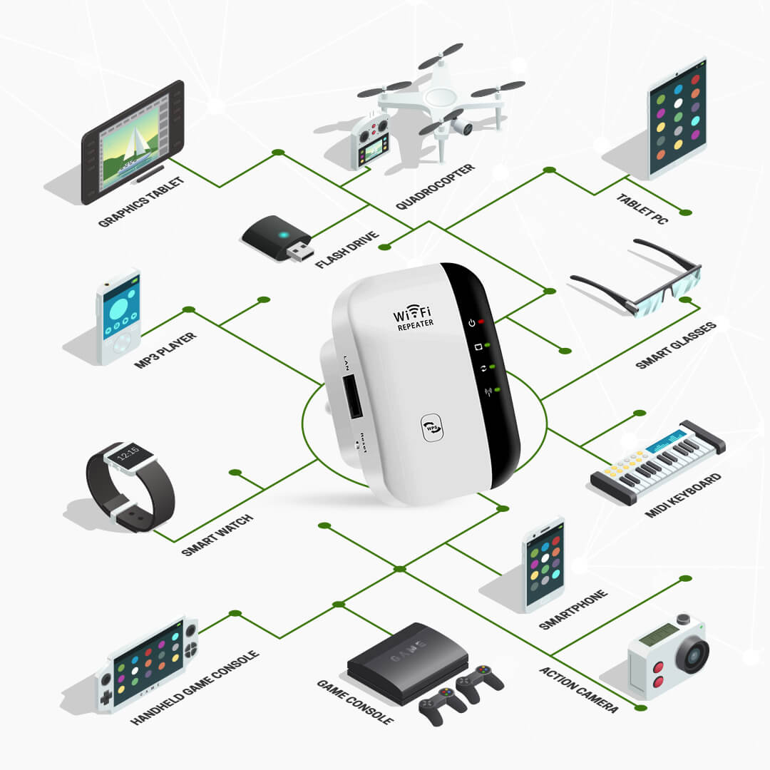 A Wi-Fi repeater is a device that boosts and extends the range of your wireless network. It receives the existing Wi-Fi signal, amplifies it, and then transmits the enhanced signal to areas with weak or no coverage. This helps eliminate dead zones in your home or office, ensuring a more reliable internet connection for devices that are far from the main router. Easy to set up, Wi-Fi repeaters are ideal for improving connectivity in larger spaces or multi-story buildings.